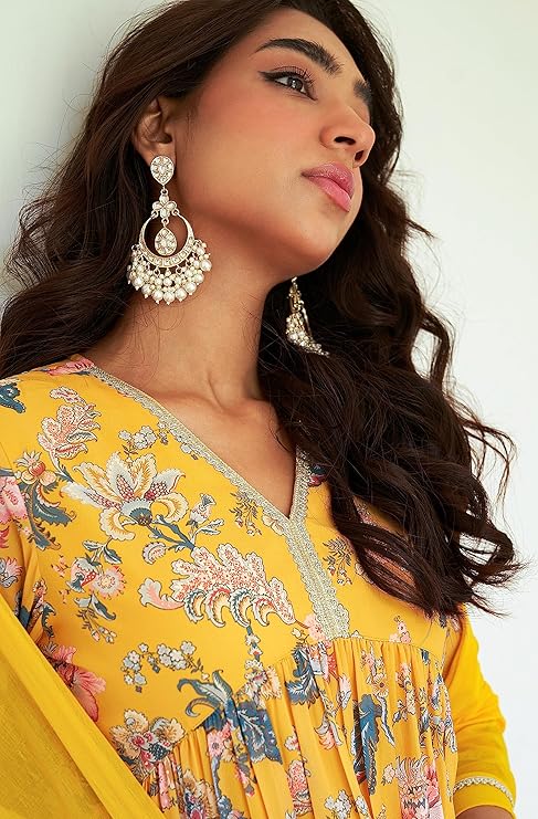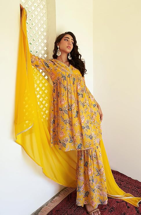 - Kurta Length: 36(inch) | Bottom Length: 40(inch) | Kurta Color: Yellow | Pattern: Digital Floral Printed | Occasion: Festive | Type: Flared | Sleeve Type: 3/4th Sleeves Regular Sleeves