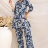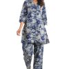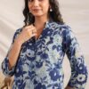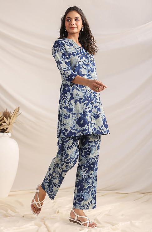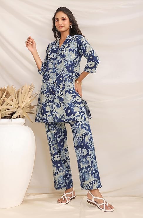 • [Features] Summer Co-ord Sets for Women, Notch Neck with Mandarin Collar, quarter regular sleeves, Cotton Co-ord Set, Indigo Color, Floral Pattern, Regular fit, Tunic and straight pant set.